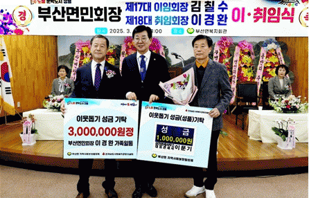 신임 이경환 면민회장은 취임사를 통해 “앞으로도 부산면의 빛나는 전통과 희망찬 미래를 위해 책임감을 가지고 열정을 다해 임하겠다”는 포부를 전했다.
