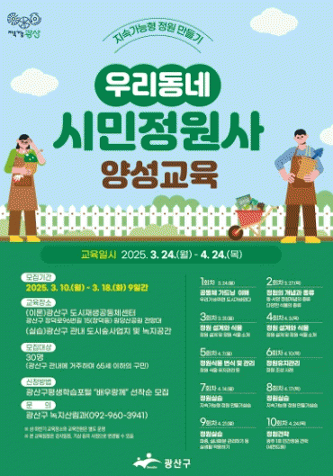 박병규 광산구청장은 “시민정원사 양성은 시민의 참여로 도심 녹지공간에 생기를 불어넣고, 오래도록 푸르고 건강하게 가꾸는 출발점이 될 것”이라며 “생활 속 녹지공간을 확대하고, 스스로 가꾸는 공동체 문화가 활성화되도록 힘껏 뒷받침하겠다”고 밝혔다.