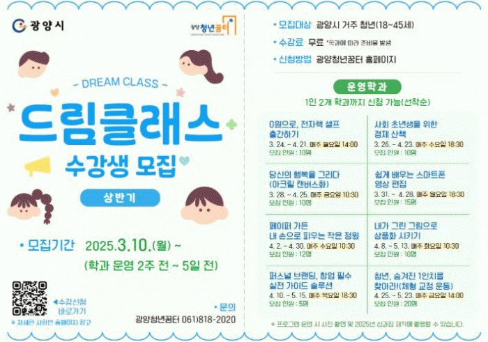 광양시 청년(18세~45세)이면 누구나 참여할 수 있으며, 신청은 3월 10일부터 학과 시작일 기준 2주 전부터 5일 전까지 순차적으로 진행된다.