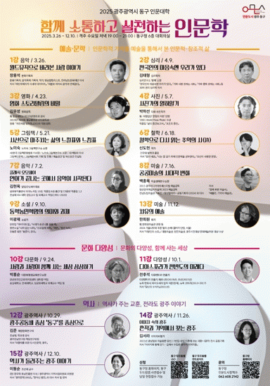 올해로 7년째 운영 중인 동구 인문대학은 이달 26일부터 오는 12월 10일까지 격주 수요일(오후 7~9시) 구청 대회의실에서 총 15회 열린다. 올 상반기에는 예술 특집강좌, 하반기에는 문화 다양성·광주역사 특집 강좌로 나눠 진행된다.