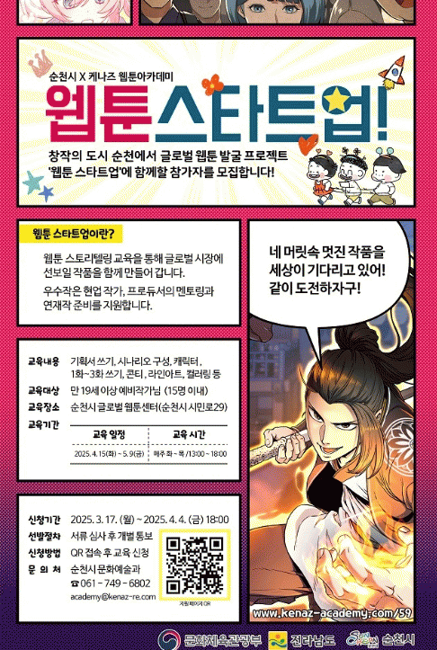 ‘웹툰 스타트업’은 순천시와 케나즈가 함께하며 앵커기업 케나즈가 입주한 순천시 글로벌 웹툰센터에서 4월 15일부터 5월 9일까지 4주간 진행한다.