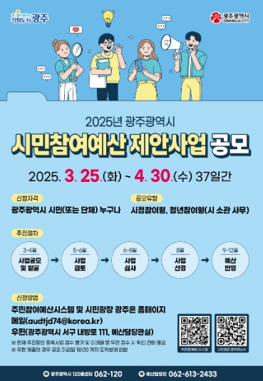 참여는 광주시 누리집(고시‧공고)에서 신청서를 내려받아 ‘광주시 주민e참여시스템’과 ‘시민광장 광주온(ON)’을 통해 온라인 접수하면 된다. 메일이나 우편(광주 서구 내방로111, 광주시 예산담당관실)으로도 접수할 수 있다.