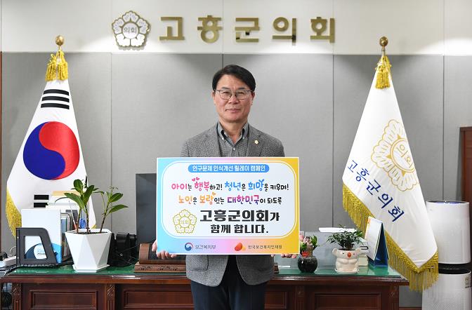 류제동 의장은 “이번 캠페인 참여가 고흥군 뿐만 아니라 전국적으로 인구감소 문제에 대한 사회적 관심과 공감을 이끌어내는 계기가 되기를 바란다”며, “앞으로도 고흥군의회는 고흥군 및 지역사회와 협력하여 인구문제 해결을 위한 실효성 있는 정책을 지속적으로 추진해 나가겠다”고 말했다.