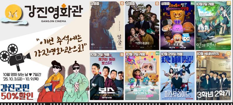 ‘영화 보는 날’은 강진군민들에게 매달 큰 호응을 얻고 있는 대표 문화 행사로, 이번 추석 연휴에도 지역민들의 즐거운 만남의 공간이 될 것으로 기대된다.