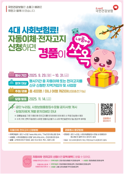 이번 경품행사는 9월 29일부터 10월 21일까지 33일간 진행되며, 대상은 4대 사회보험료 전자고지와 자동이체(계좌, 신용카드)를 신규 신청한 세대 및 사업장이다.