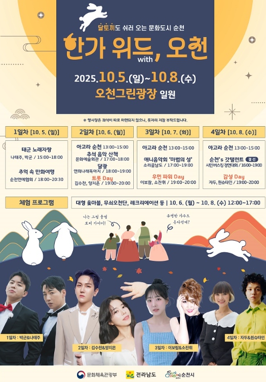 특히, 순천 지역예술인들이 참여하는 ‘아고라 순천’ 무대도 10월 6일부터 8일까지 매일 오후 2시에 열려, 지역 문화예술의 다양성과 에너지를 현장에서 직접 느낄 수 있다.