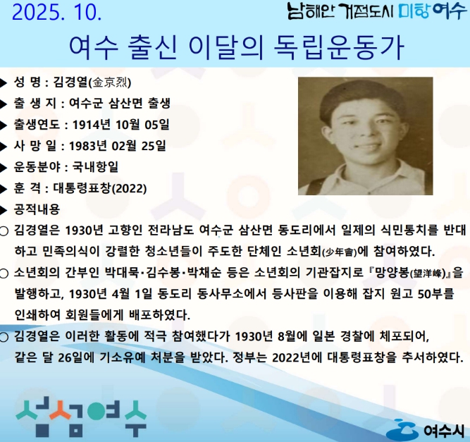 여수시 관계자는 “조국의 자주와 정의를 위해 용기 있게 나섰던 독립운동가들의 희생을 잊지 말아야 한다”며 “앞으로도 지역의 숨은 독립운동가들을 널리 알리는 데 최선을 다하겠다”고 밝혔다.