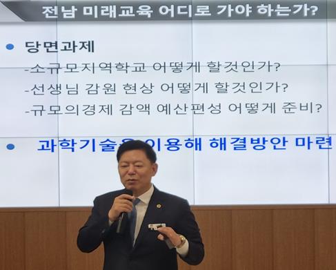 이어 김 위원장은 전남 교육이 직면한 소규모 학교 운영, 교원 감축, 예산 부족 등 구조적 한계를 진단하며, 이에 대한 대안으로 ‘2030 미래 교실’ 비전을 제시했다.