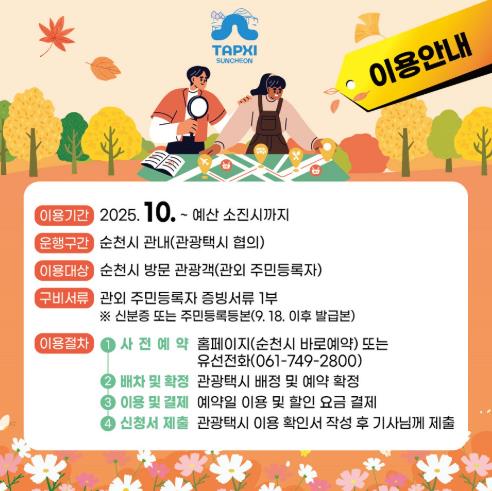 시 관계자는 “이번 가을맞이 관광택시 반값 이벤트가 보다 더 많은 관광객들이 순천을 찾는 계기가 되길 바란다”며, “가을빛으로 물든 순천의 다채로운 풍경 속에서 편안하고 특별한 시간을 보낼 수 있기를 바란다”고 전했다.