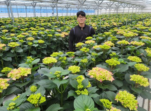 김승찬 대표는 한국농수산대학 화훼학과 출신의 청년 농업인으로, 2023년부터 현대식 스마트팜 하우스를 신축해 수국 재배를 본격화했다.