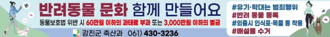 강진군 관계자는 “모든 주민이 함께 안전하고 행복한 생활을 영위할 수 있도록, 성숙한 반려동물 문화조성에 적극 동참하여 주길 바란다”고 당부했다.