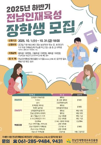 신청기한은 31일까지며, 전남인재평생교육진흥원 누리집에서 온라인으로 신청하거나 해당 기관에서 방문 접수하면 된다.