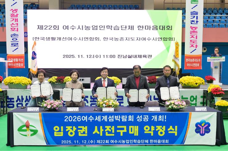 이날 행사에는 한국농촌지도자전라남도연합회와 한국생활개선전라남도연합회가 함께 참여해 총 4개 단체가 2,500만 원 규모의 2026여수세계섬박람회 입장권 구매 약정식을 진행하며 박람회 성공개최 염원에 뜻을 모았다.