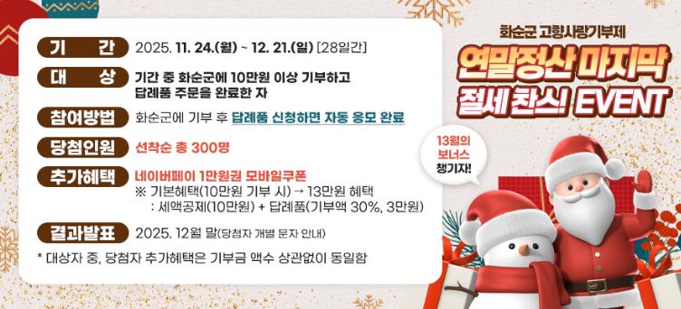 이벤트 참여 방법은 이벤트 기간 내 화순군에 10만 원 이상 기부한 뒤 답례품을 주문하면 자동으로 이벤트에 참여한 것으로 설정되며, 선착순 300명에게 네이버페이 1만 원 모바일 쿠폰을 추가로 증정한다.