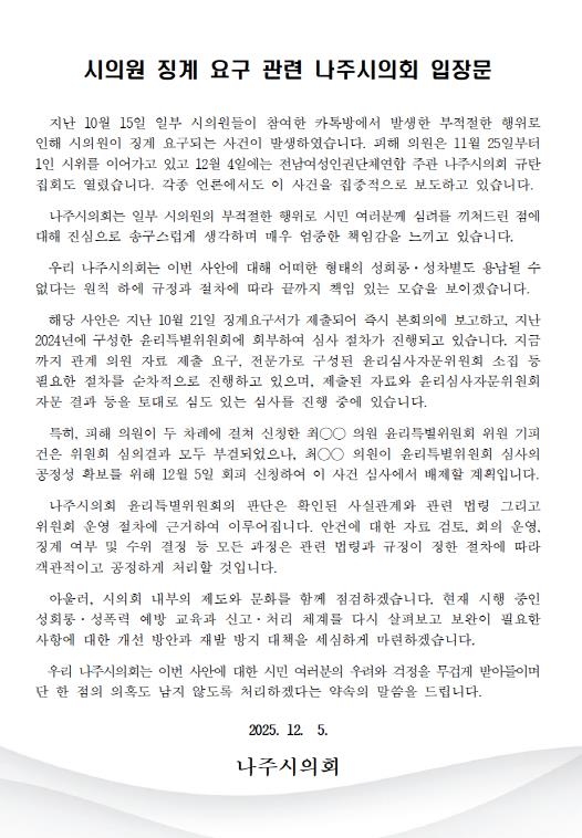 의회는 이번 사안을 계기로 성희롱·성폭력 예방 교육과 신고·처리 체계를 다시 점검하고, 필요한 제도 개선과 재발 방지 대책을 마련하겠다는 계획을 제시했다.