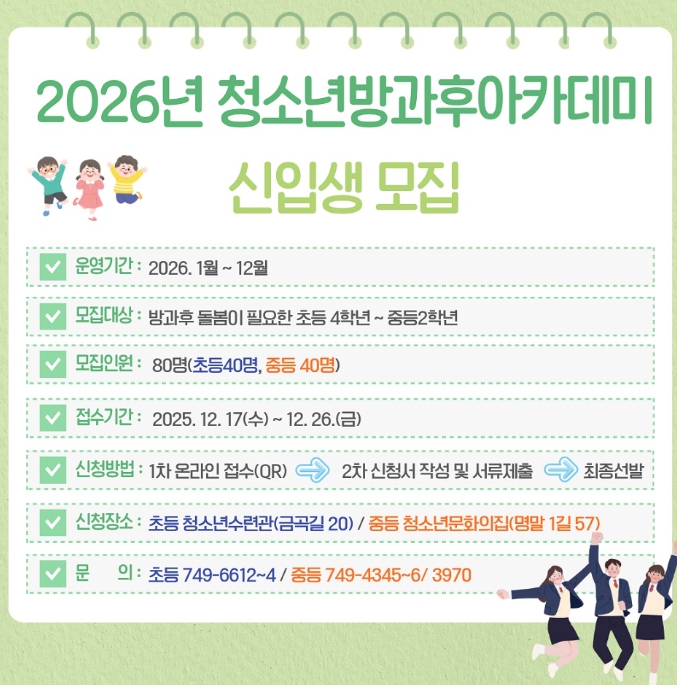 모집 대상은 청소년수련관에서 초등학교 4~6학년 40명, 청소년문화의집에서 중학교 1~2학년 40명이며, 정원을 초과할 경우 대기자로 등록된다.