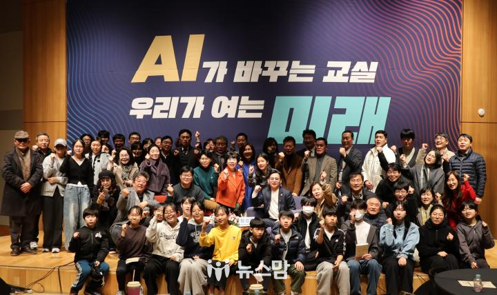 | | 19일 오후 광주과학기술원(GIST) 오룡관에서 열린 ‘AI가 바꾸는 교실, 우리가 여는 미래’ 사제 토크콘서트를 마친 뒤 정재승 KAIST 교수(가운데 왼쪽)와 정성홍 전 광주시교육감 민주진보단일후보(가운데 오른쪽)가 시민, 학생 등 참석자들과 함께 기념 촬영을 하며 파이팅을 외치고 있다. |