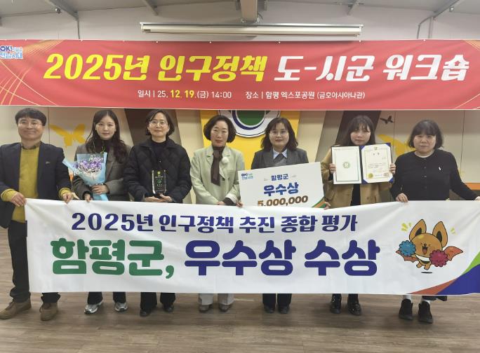 함평군은 전남도가 지난 19일 함평엑스포공원 금호아시아나관에서 개최한 ‘2025년 인구정책 종합평가’에서 우수상을 수상했다고 22일 밝혔다.