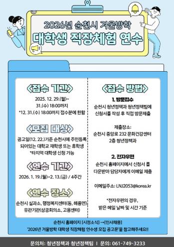 선발된 연수생은 2026년 1월 19일부터 2월 13일까지 4주간 순천시청 및 행정복지센터와 유관기관에 배치되어 하루 5시간씩 근무하며, 행정업무를 보조하고 공공부문 업무 전반을 직접 체험하게 된다.