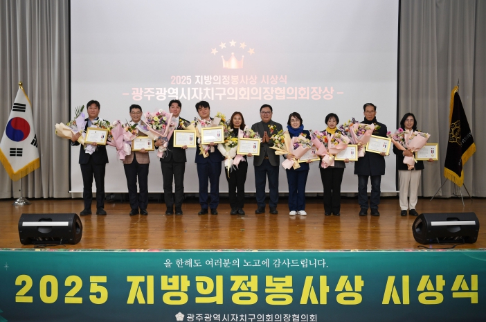 ‘지방의정봉사상’은 광주 자치구의회 의원을 대상으로 지역 발전과 주민을 위해 헌신적으로 의정활동을 펼친 우수 의원을 선정해 수여하는 상이다. 올해는 총 20명이 선정됐으며, 이 중 5명에게 ‘대한민국시군자치구의회의장협의회장상’을, 10명에게 ‘광주광역시자치구의회의장협의회장상’을 각각 수여했다.