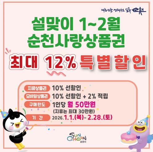 앞서 순천시는 지난해 새해 기간에도 순천사랑상품권 할인 판매를 추진해 전통시장과 골목상권을 중심으로 매출 회복과 소비 활성화에 긍정적인 성과를 거둔 바 있다.