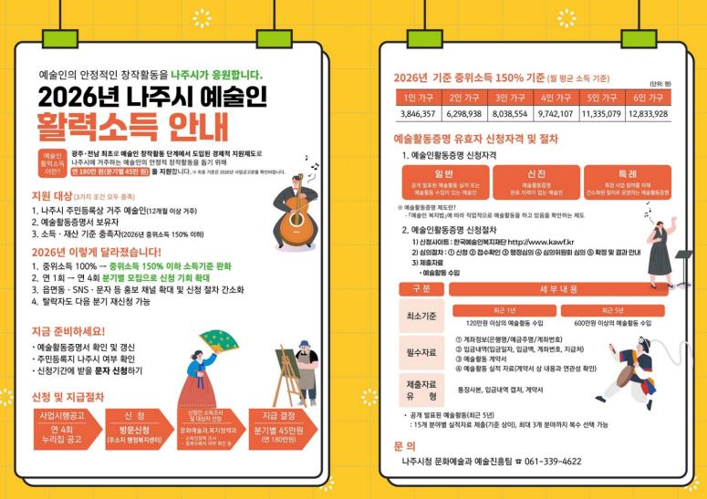 지원 대상은 공고일인 2026년 2월 2일 기준 나주시에 12개월 이상 주민등록을 두고 실제 거주 중인 예술인으로 한국예술인복지재단의 예술활동 증명서를 유효하게 보유하고 2026년 기준 중위소득 150%(1인 가구 기준 월 384만 6357원) 이하 요건을 충족해야 한다.