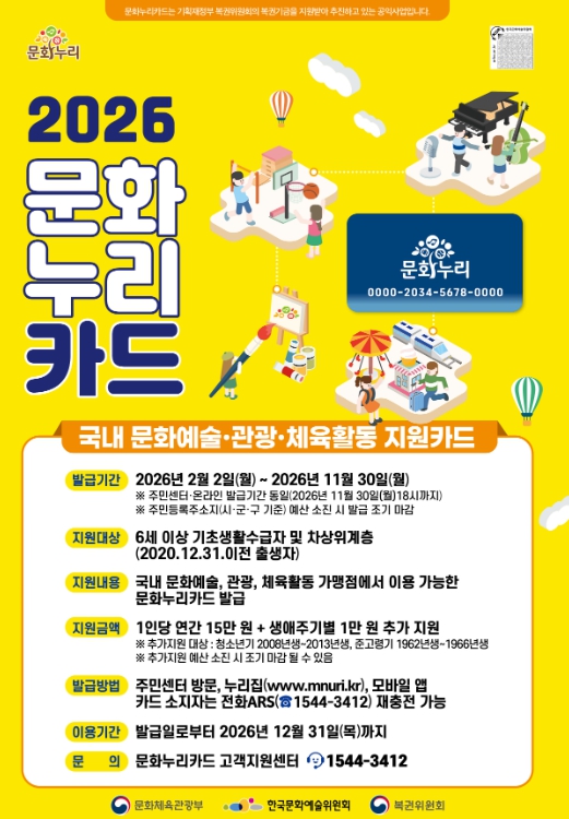 문화누리카드는 문화예술·국내여행·체육활동 이용을 지원하는 제도로, 2026년에는 지난해 대비 1만 원 인상된 연간 15만 원이 지원된다.