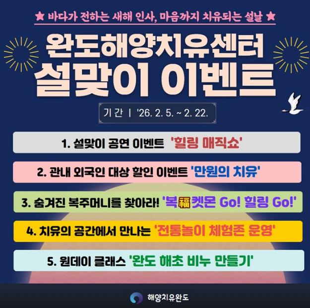 군 관계자는 “명절은 오랜만에 가족이 모이는 소중한 시간인 만큼 완도해양치유센터에서 힐링하며 특별한 추억을 남겨보길 바란다”면서 “앞으로도 완도에서만 즐길 수 있는 해양치유 콘텐츠로 웰니스 관광 활성화에 힘쓰겠다”라고 말했다.