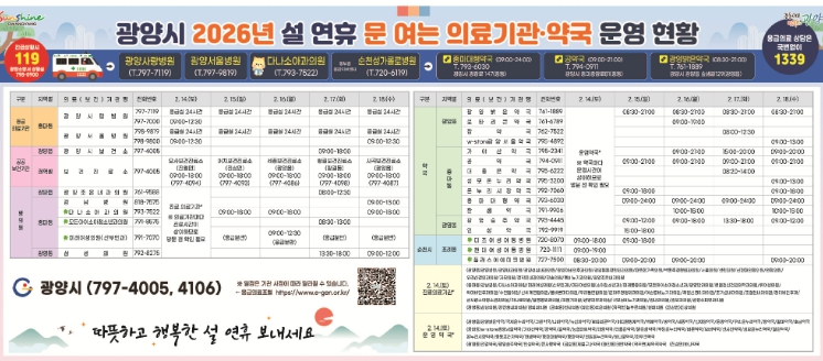 연휴 동안 지역 응급의료기관인 ▲광양사랑병원 ▲광양서울병원 등 2개소는 응급실을 24시간 비상체제로 운영하며, 관내 병·의원 105개소, 보건의료기관 6개소, 휴일지킴이 약국 46개소가 문을 열어 의료 서비스를 제공한다.