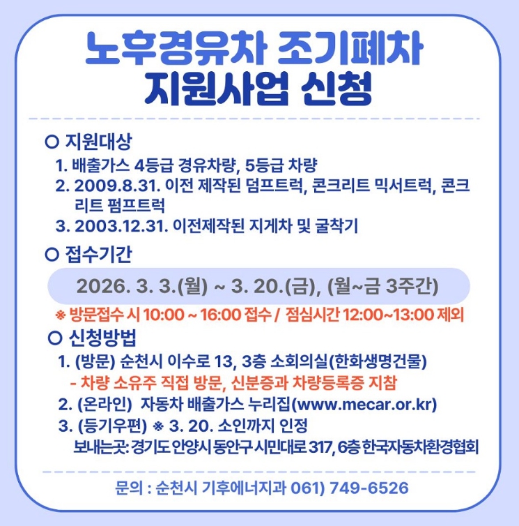 신청을 희망하는 차량 소유자는 자동차배출가스 종합전산시스템을 통해 신청하거나, 순천시 생태환경센터 3층(이수로 13) 방문 접수 또는 등기우편을 통해 신청할 수 있다.
