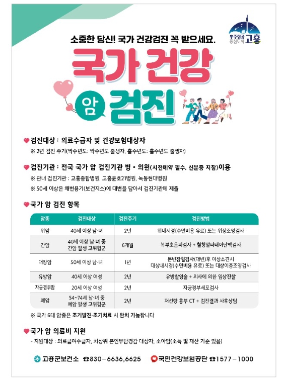 국가암검진 및 의료비 지원에 관한 자세한 사항은 고흥군 보건소 지역보건팀으로 문의하면 안내받을 수 있다.