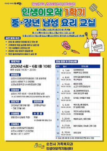 수강 신청은 9일부터 20일까지 순천시 인생이모작지원센터를 방문해 접수하면 되며, 모집 정원 충족 시 조기 마감될 수 있다.