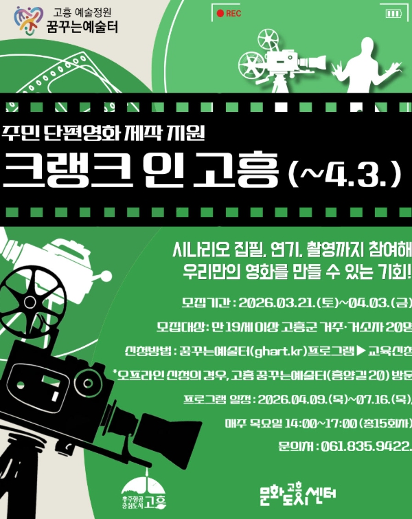 권지애 고흥군문화도시센터장은 “최근 특정 지역을 배경으로 한 영화가 화제가 되듯 우리 고흥에도 영화 같은 이야기가 무궁무진하다”며 “주민들의 시선으로 빚어낸 이야기가 지역 공동체에 새로운 활력을 불어넣고, 고흥의 문화적 저변을 넓히는 계기가 되길 바란다”고 전했다.
