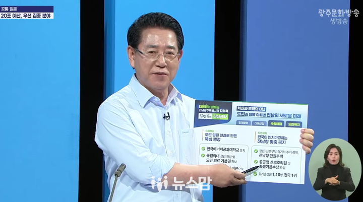 MBC를 통해 광주·전남 전역에 생방송된 이날 토론회는 각 예비후보의 지역발전 비전·정책을 소개하고 자질을 검증하는 자리로, 김 예비후보 외에 강기정·민형배·주철현 예비후보가 참여했다.