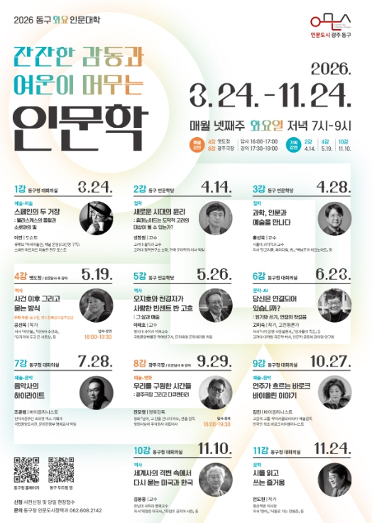 올해로 8년째를 맞는 동구 인문대학은 운영 요일을 화요일로 변경해 매월 넷째주 화요일에 진행되며, 첫 강의는 24일 오후 7시부터 9시까지 동구청 대회의실에서 열린다.