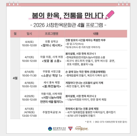 허성자 체육관광과장은 “서창한옥문화관을 전통문화 체험과 지역 관광을 잇는 문화 거점으로 만들겠다”며 “봄기운 가득한 서창에서 소중한 사람들과 특별한 추억을 만들길 바란다”고 말했다.
