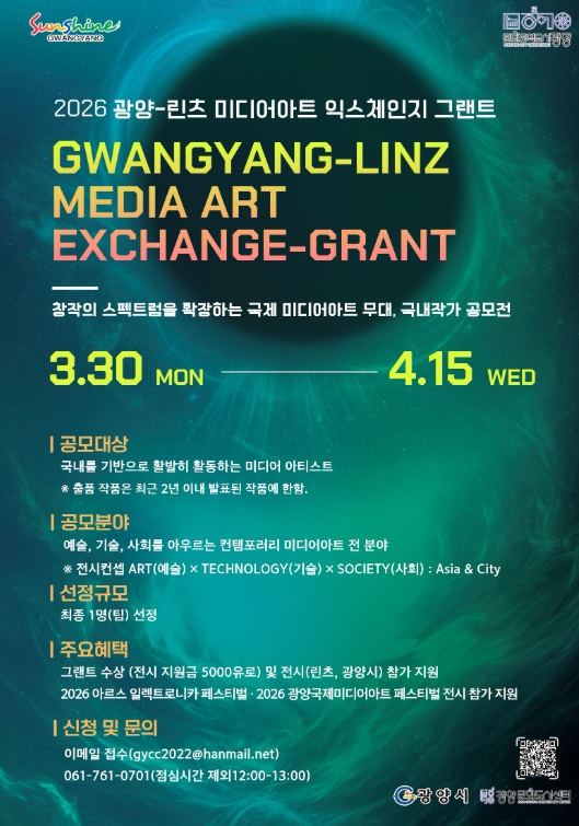 광양문화도시센터장은 “이번 미디어아트 익스체인지 그랜트는 국내 작가들이 세계적인 미디어아트 플랫폼과 교류하며 성장할 수 있는 계기가 될 것”이라며 “기술과 사회의 접점에서 새로운 예술적 담론을 제시할 작가들의 많은 관심과 참여를 바란다”고 밝혔다.