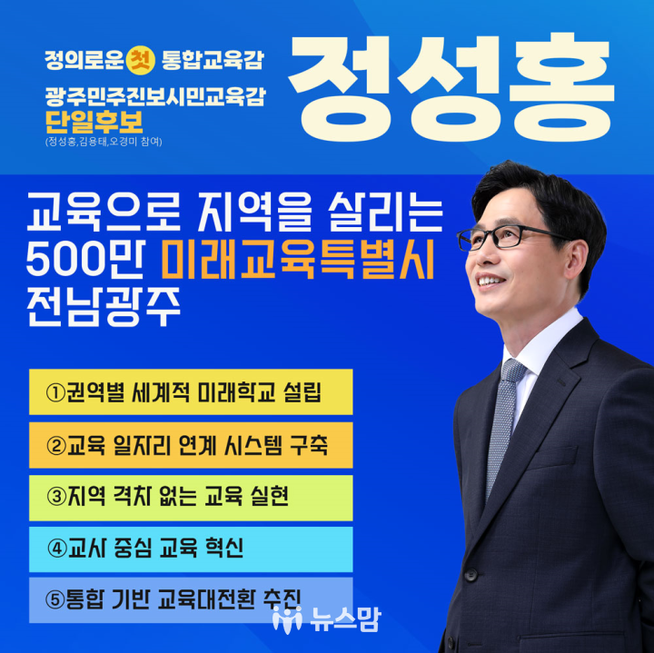 또한 정 후보는 전남광주를 글로벌 교육 중심 도시로 도약시키겠다는 목표 아래 핵심 비전으로 ‘500만 미래교육특별시’를 제시했다. 정 후보는 통합교육 실현을 위한 5대 혁신 공약으로 ①권역별 세계적 미래학교 설립 ②교육 일자리 연계 시스템 구축 ③지역 격차 없는 교육 실현 ④교사 중심 교육 혁신 ⑤통합 기반 교육대전환을 발표했다.