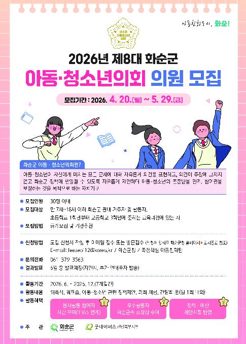선발된 의원들은 6월 아동권리교육 이수를 시작으로 ▲7월 위촉식 ▲8~9월 정기회의와 지역탐방 활동 ▲11월 모의회의 체험과 군의원 간담회 ▲12월 해단식 등 다양한 의정활동에 참여하게 된다.