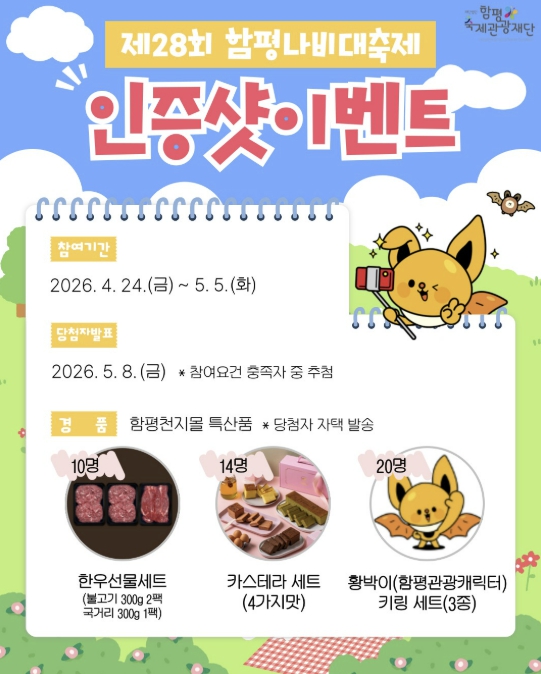 이벤트는 축제 개막일인 오는 24일부터 5월 5일까지 축제 기간 진행하며, 추첨을 통해 총 44명에게 경품을 제공한다. 경품으로는 함평천지몰 상품과 함평 관광 캐릭터 ‘황박이’ 열쇠고리 등이 준비돼 있다.