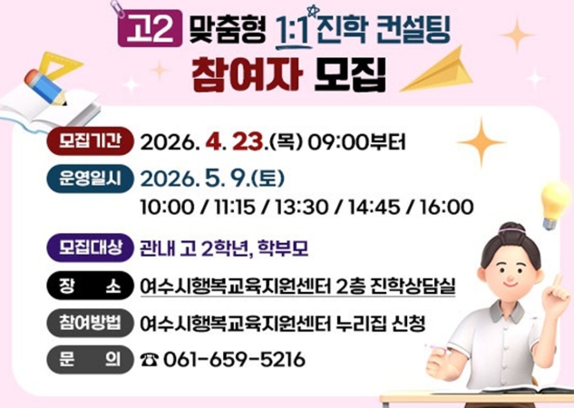 한편, 여수시행복교육지원센터에서는 지역의 학생과 학부모에게 최신 교육 경향을 반영한 ▲학년별 시기별 대입 진학 컨설팅 ▲대학생 선배 멘토링 ▲고교학점제 특강 ▲대학 탐방 캠프 등 다양한 프로그램 운영으로 학생과 학부모들로부터 큰 호응을 얻고 있다.