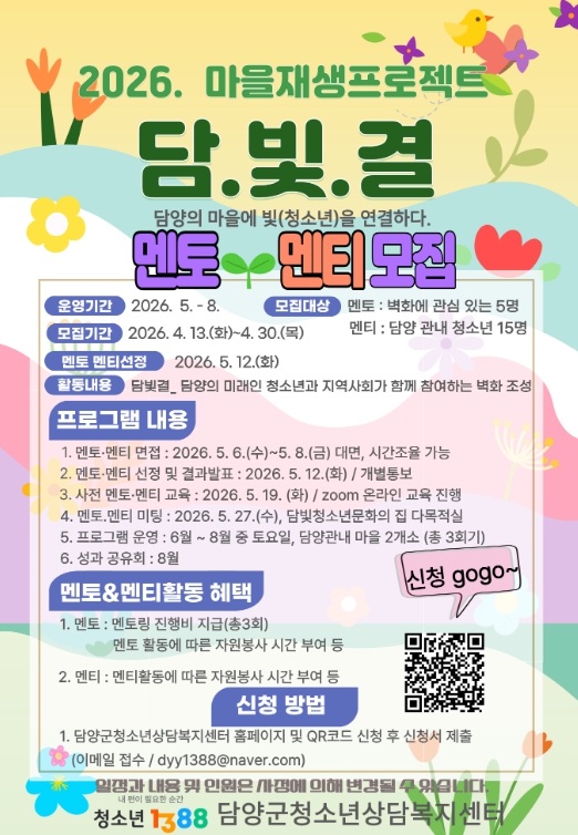 멘티 15명과 멘토 5명을 선발할 예정이며, 멘티는 담양 지역 내 만 9세부터 18세까지 청소년을 대상으로 한다.