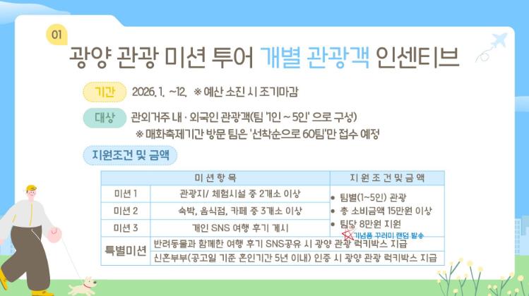 광양관광 인센티브는 기업 연수·회의 등 마이스(MICE)를 포함한 단체관광, 윤동주 테마관광, 개별 미션투어 등으로 구성돼 여행 형태에 따라 선택해 이용할 수 있다.