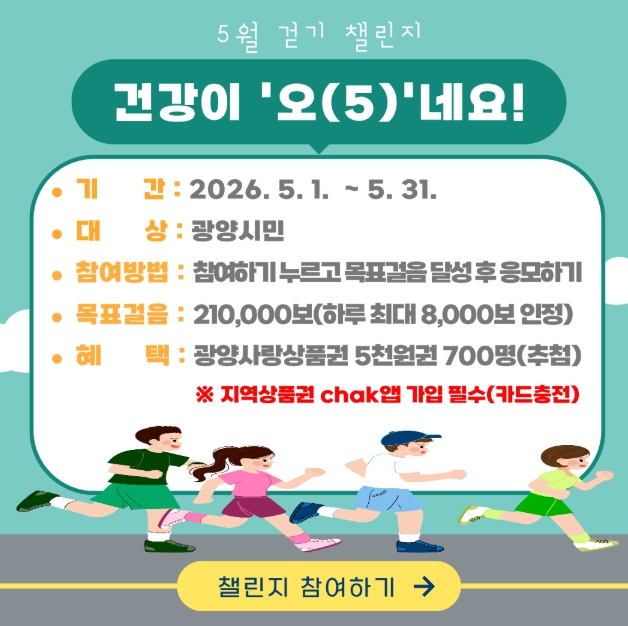 이번 챌린지는 하루 최대 8천 걸음까지 인정되며, 기간 내 누적 21만 보를 달성한 참여자는 광양사랑상품권 5천 원권 응모 자격이 주어진다. 시는 목표 걸음 수를 달성한 참여자 중 추첨을 통해 700명에게 상품권을 지급할 계획이다.