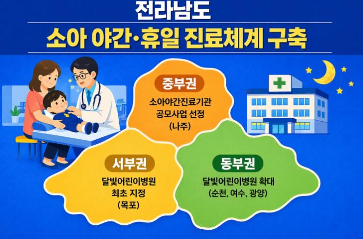 이에 전남도는 소아 청소년 야간·휴일 진료 공백의 현실적 운영 구조 개선을 위해 보건복지부 제도 개선 건의 및 공모사업 확보, 의료기관·지역의사회 등과 진료체계 개선을 위한 협의를 지속 추진했으며, 그 결과 권역별 의료 인프라가 크게 강화됐다.