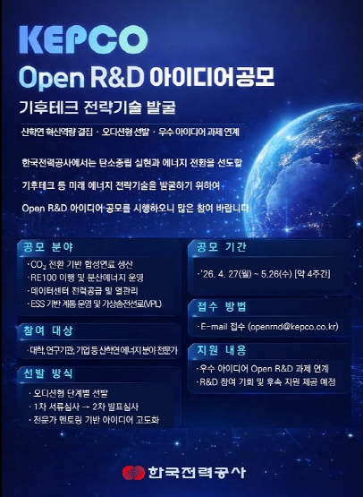 이번 공모는 내부 중심의 연구개발 방식에서 벗어나 외부의 창의적 아이디어를 적극 활용하기 위해 마련됐다. 대학, 연구기관, 기업 등 에너지 분야 전문가라면 누구나 참여 대상이다.