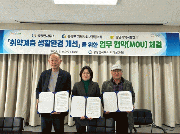 우미자 봉강면장은 “복지 위기가구의 건강증진과 생활환경 개선에 큰 도움이 되리라 생각한다”며 “앞으로도 민.관 협력을 바탕으로 복지 안정망을 더욱 촘촘하게 구축해 나가 누구나 살고 싶은 봉강면을 만드는 데 최선을 다하겠다“고 말했다.