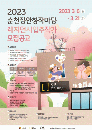 순천시 관계자는 “장안창작마당은 입주예술인, 지역예술인, 지역민이 함께 예술로 소통하고 문화를 나누는 공간이다”라며, “장안창작마당에서 다양한 창작 활동과 문화적 교류가 이루어지고 예술의 가치가 확산될 수 있도록 많은 예술가의 적극적인 참여를 바란다”고 말했다.