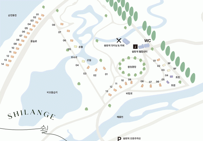 쉴랑게 캐빈은 ‘윤슬로’, ‘호수로’, ‘바람로’ 총 3개로 구성하여 3만 5천평의 넓은 정원에 조성되어 있다. ‘윤슬로’는 햇볕에 반사되어 반짝이는 동천이 내려다보이고 캐빈 위로 벚꽃이 만발한 곳으로 2인 커플 전용으로 추천한다.