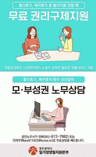 광주에 주소지를 둔 월 소득 300만원 미만 직장인 부모가 권리구제지원을 신청하면, 직장인 부모를 대신해 사업주와의 면담·협의 등 사적 조정부터 노동청 신고 또는 노동위원회 구제신청까지 일가정양립지원본부 협력 노무사가 대리한다.